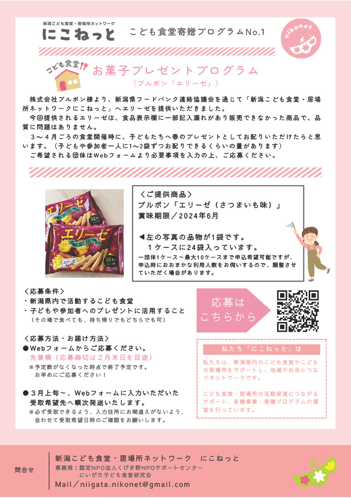 この度株式会社ブルボン様より、新潟県フードバンク連絡協議会を通じて「新潟こども食堂・居場所ネットワーク にこねっと」へエリーゼを提供いただきました。