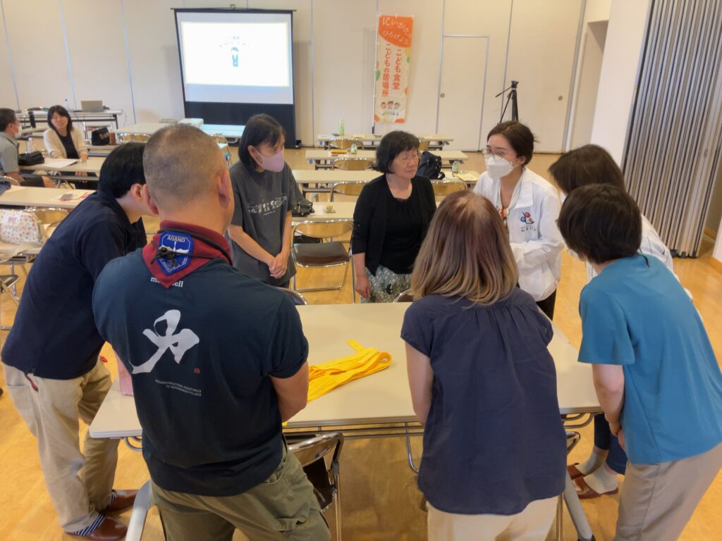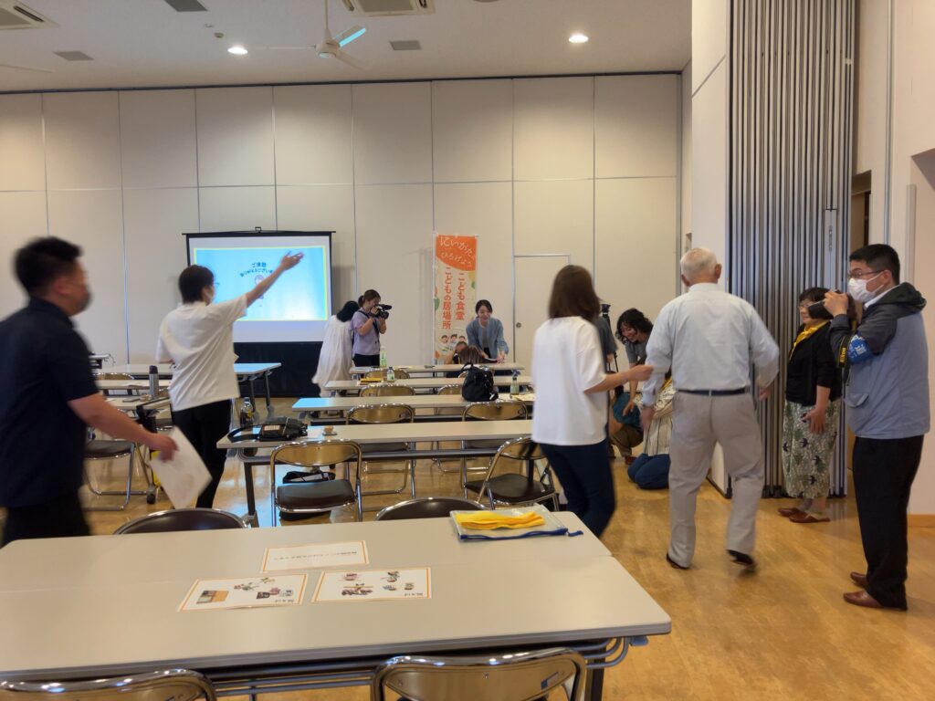 会の後半では、認定NPO法人全国こども食堂支援センター・むすびえ主催の「こども食堂防災研修in上越」が開催されました。前半の参加者に加えて地元防災士の方や行政関係者らが加わり、居場所運営時の防災対策や災害時にこども食堂ができることについての講習を受けたほか、居場所運営時の被災を想定した避難訓練が行われました。参加者が大人役とこども役にわかれて実際に被災時を想定した行動を取ってみることで、避難時の注意点を確認しあいました。